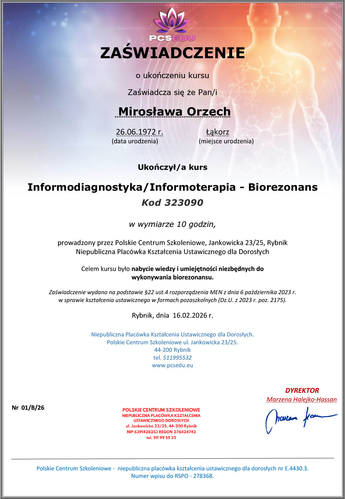 Nazywam się Mirosława Orzech i od ponad 20 lat z pasją wspieram ludzi w odzyskiwaniu zdrowia, harmonii i spokoju. Jako doświadczony refleksolog, naturopata oraz terapeuta ustawień systemowych, prowadzę gabinet naturoterapii w Gdańsku, oferując holistyczne podejście do zdrowia, które łączy tradycyjne metody z nowoczesnymi technikami terapeutycznymi.